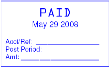 An important stamp to cancel a paid invoice. When used with the "Entered" stamp, it helps to track the status of invoice vouchers. Has an invoice been entered? Has it been paid? How much was paid? Stamp has description for G/L account, posting period and amount.